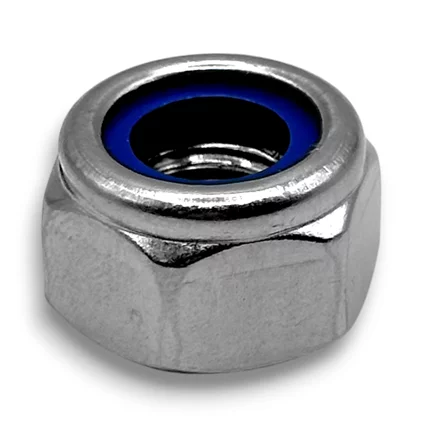 Podczas dokręcania, gwint śruby wcina się w nylonowy pierścień umieszczony w górnej części nakrętki. Powoduje to powstanie oporu i kasowanie luzów na gwincie, co skutecznie blokuje nakrętkę w ustalonej pozycji, nawet jeśli nie jest ona dokręcona do oporu.