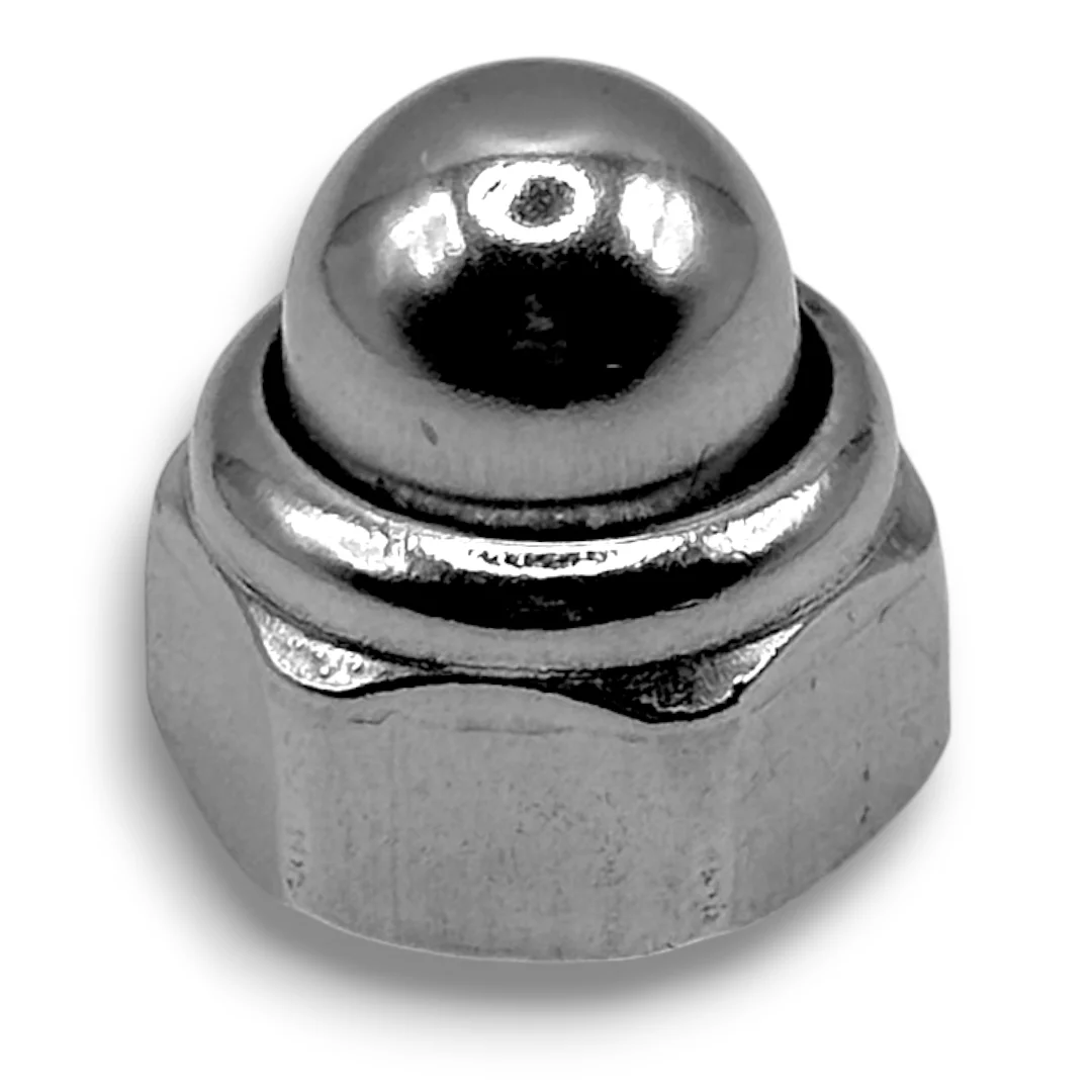 Nakrętka kołpakowa samohamowna - DIN 986Nakrętka wg normy DIN 986 to zaawansowany element złączny typu "2 w 1". Łączy ona estetykę i bezpieczeństwo nakrętki kołpakowej (zamkniętej) z niezawodnością nakrętki samohamownej.